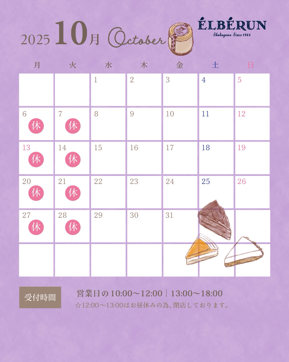 ・‥…━…‥・‥…━…‥・‥…━…‥・‥…━…‥10月の受注・発送日のお休みは下記の通りとなっております。