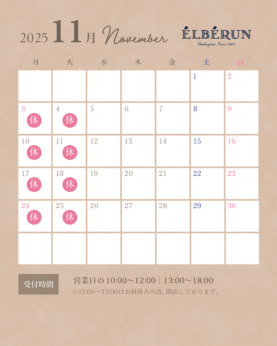 ・‥…━…‥・‥…━…‥・‥…━…‥・‥…━…‥11月の受注・発送日のお休みは下記の通りとなっております。