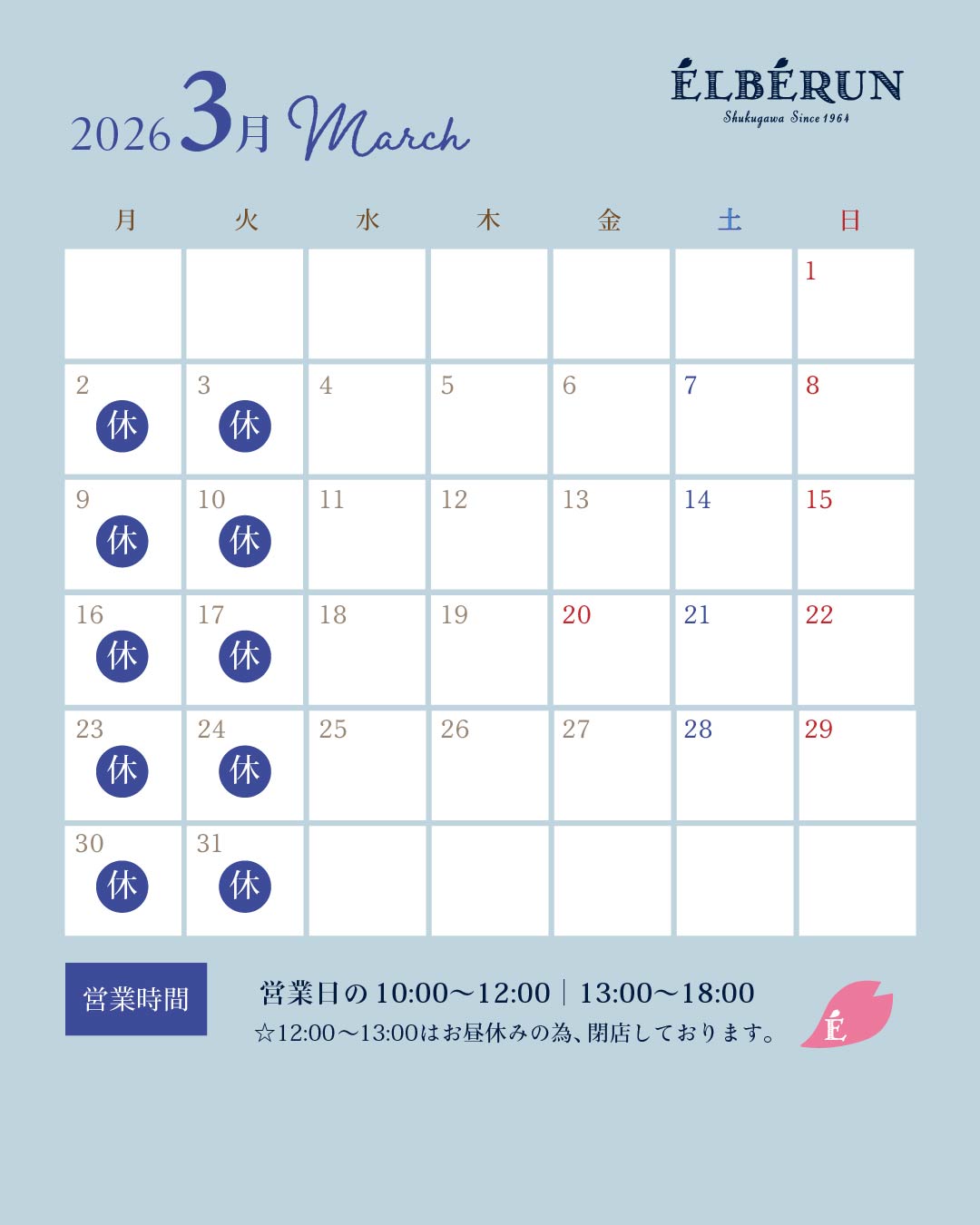 3月の受注・発送日のお休みは下記の通りとなっております。